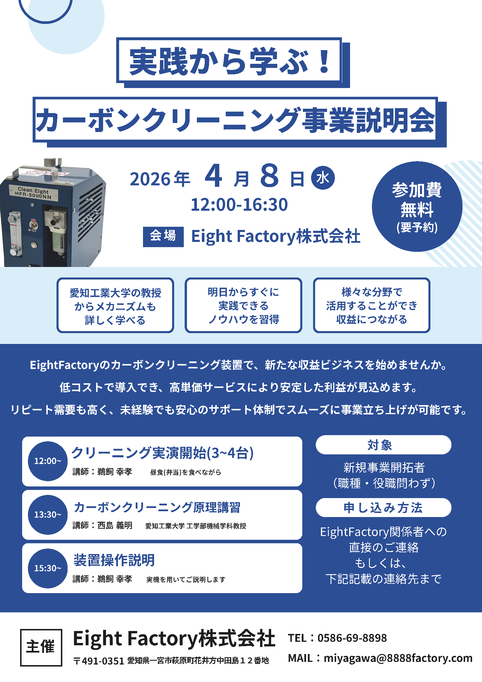 カーボンクリーニング事業説明会実施のお知らせ2026.04.06 この記事のタイトルとURLをコピーする2026年4月8日(水) 12:00~16:30 EightFactory本社にて カーボンクリーニング事業説明会を実施いたします。詳細はチラシをご覧ください。 カーボンクリーニング 募集チラシ